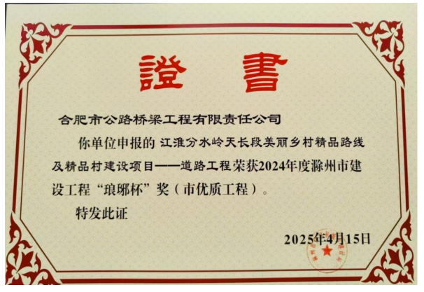 日前,滁州市住房和城乡建设局、滁州市交通运输局、滁州市水利局联合公布了2024年度滁州市建设工程“琅琊杯”奖获奖名单。合肥路桥承建的 江淮分水岭天长段美丽乡村精品路线及精品村建设项目(二期)道路工程项目荣获2024年度滁州市建设工程“琅琊杯”奖。