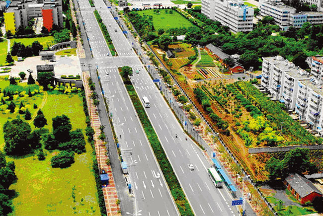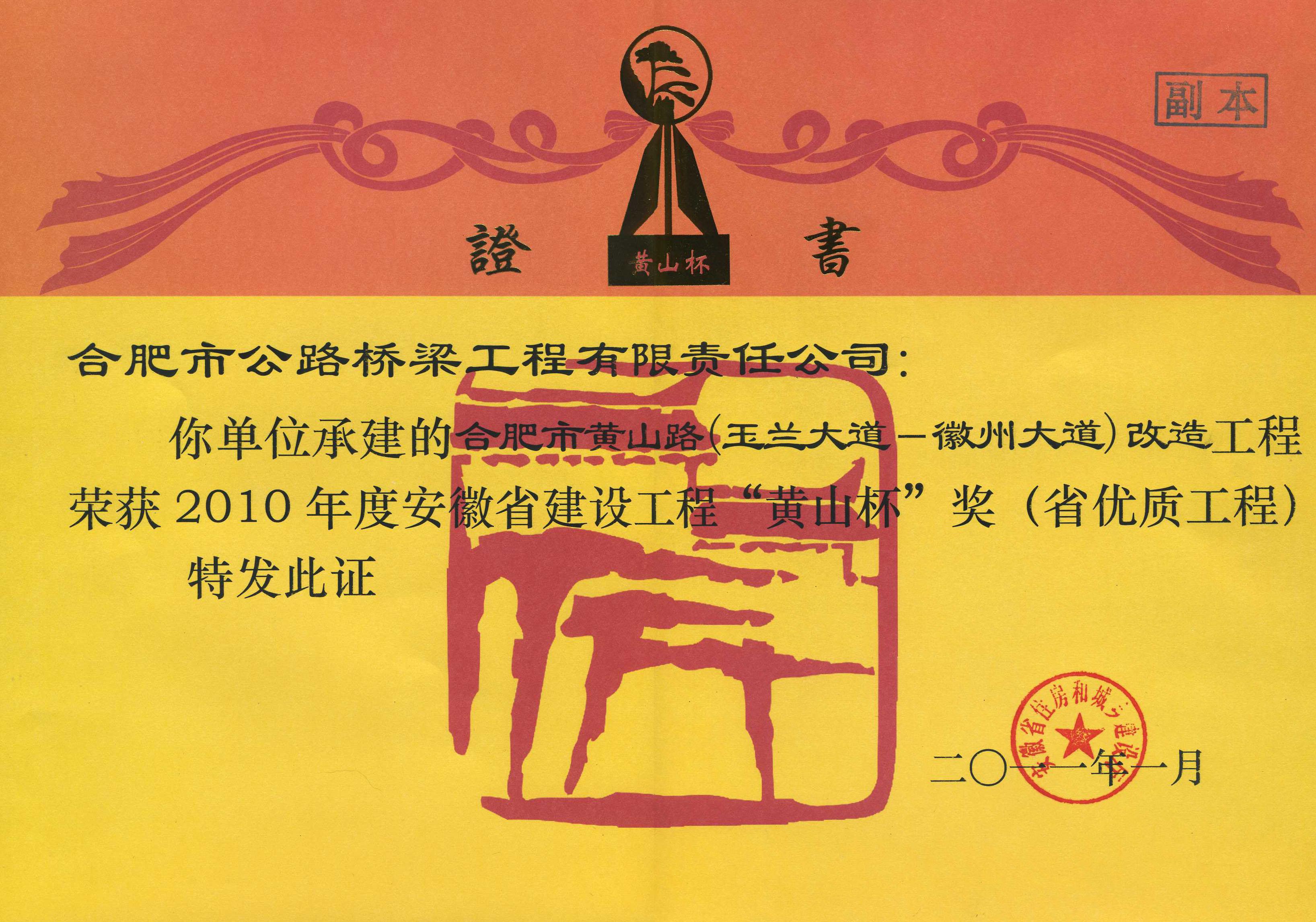 黄山路位于合肥市核心区南部,西起玉兰大道东至徽州大道,是合肥市东西向重要交通通道,是连接老城区和高新开发区及大蜀山风景区的重要通道,是合肥市“141”发展战略实施的一部分。道路全长9.08KM,双向8车道,为城市I级主干道,全线与23条道路相交。该项目建设中采用了砼板块破碎再生水稳与砼板块压浆技术,有效解决了旧混凝土废料处理问题,大大减少工程量,缩短了施工工期,降低了生产成本。该项目荣获了安徽省建设工程“黄山杯”奖(省优质工程)