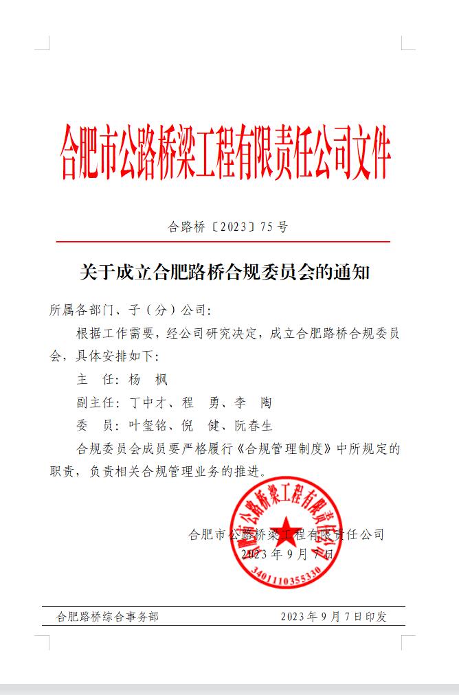 关于成立合肥路桥合规委员会的通知