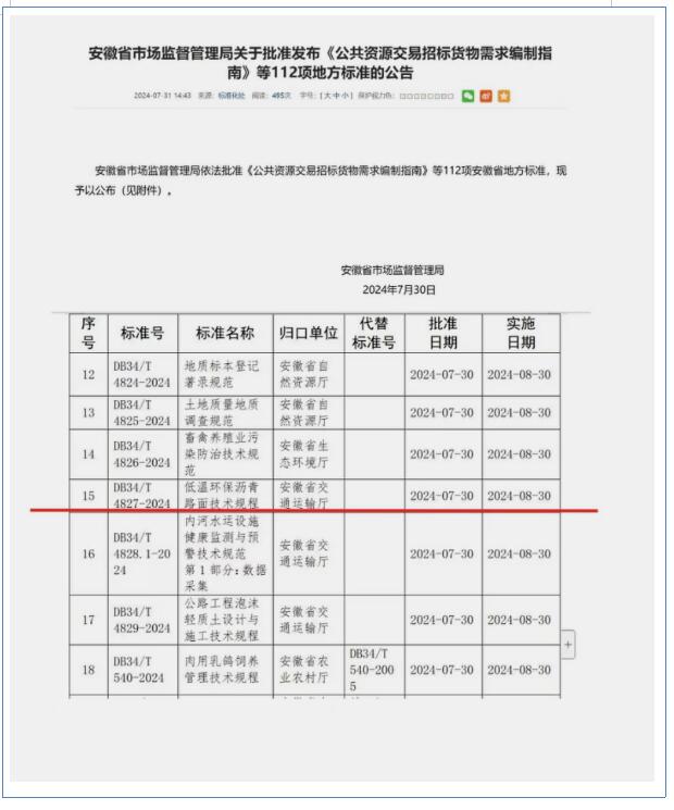 近日,由合肥路桥主持编制的安徽省地方标准《低温环保沥青路面技术规程》(DB34/T 4827-2024)经安徽省市场监督管理局批准发布,并将于2024年8月30日正式实施。