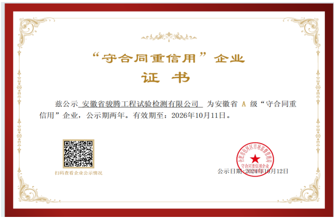 日前获悉,合肥路桥骏腾检测荣获安徽省A级“守合同重信用”企业。