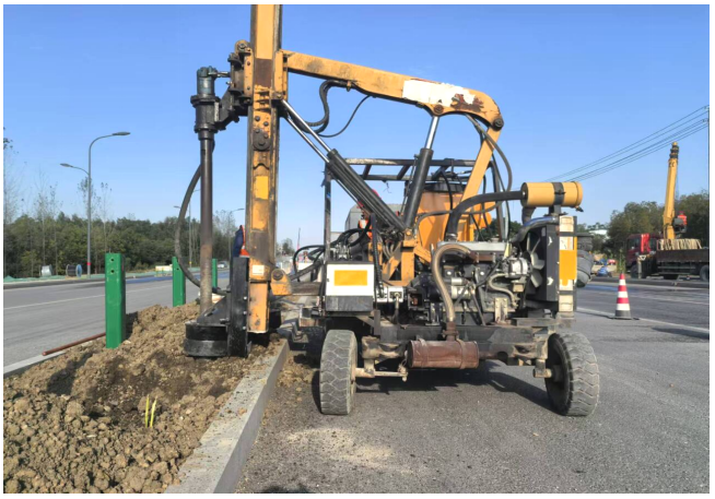 G312合六路(肥西段)快速化改造工程为老路改建项目,经过历次改建,中分带基层多为水泥混凝土板块,防撞护栏立柱施工必须钻孔,以往传统的防撞护栏立柱钻孔,耗时、耗力,极易产生扬尘,经过改装后的钻孔机粉尘吸净率高达98%,排放满足PM2.0,无需洒水车扫刷即可让粉尘等全面回收,不仅节省了车辆及人工成本,还解决了钻孔对周边环境的扬尘污染,这对环保施工具有重要意义。