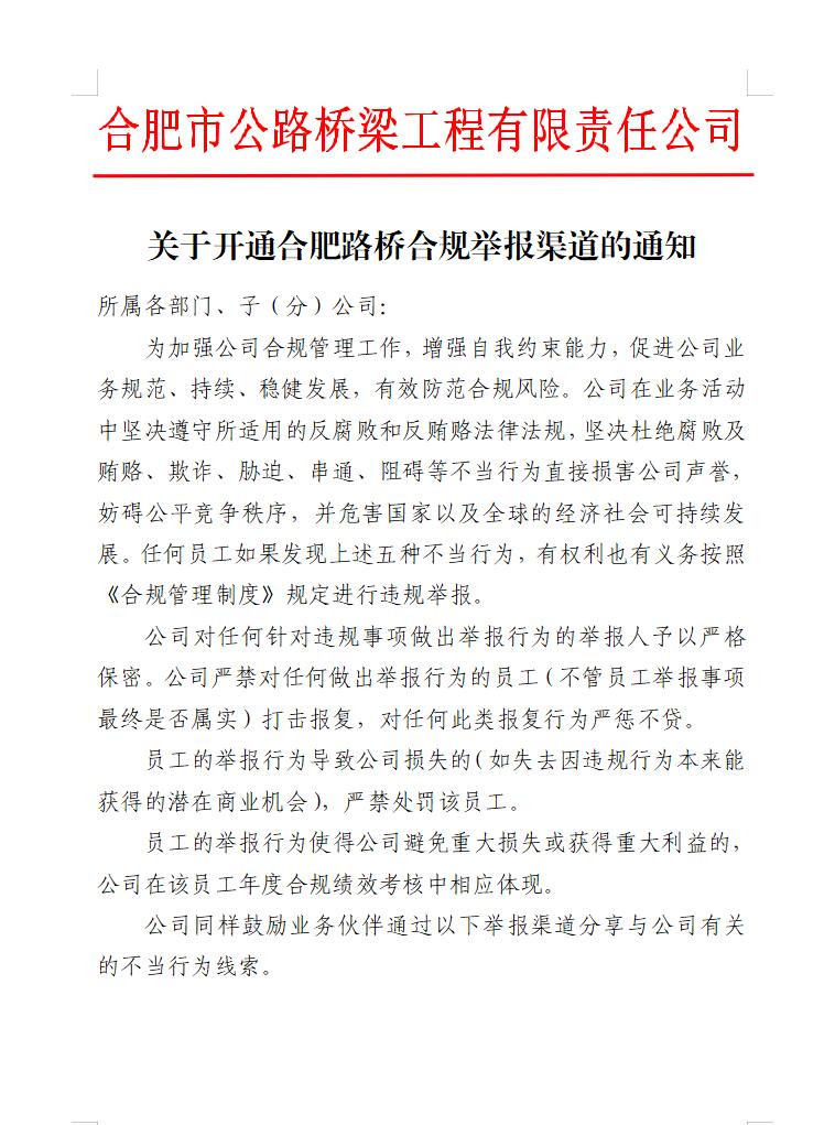 关于开通合肥路桥合规举报渠道的通知