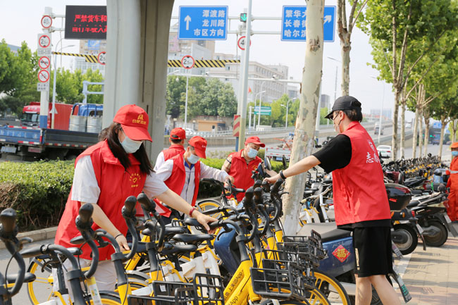 共享单车给群众带来出行方便,节约行程时间。但随之而来的,也存在胡乱摆放、乱占道等不文明现象,既妨碍交通,也影响了城市的环境秩序与文明形象。志愿者对占压盲道、绿化带、人行道等违规停放的车辆,按照“集中停放、摆放有序、朝向一致”的原则,重新进行规范摆放,切实维护共享单车的停车秩序, 并向过往行人积极宣传文明行车,有序停放的重要意义。