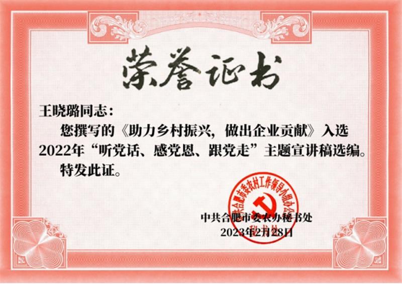 国产精品午夜福利免费 > 党群廉政 > 详细新闻近日,由市委农办、市委宣传部等七部门联合举办的“听党话、感党恩、跟党走”主题教育活动宣讲稿选编结果正式揭晓。合肥路桥王晓璐同志撰写的《助力乡村振兴,做出企业贡献》成功入选。